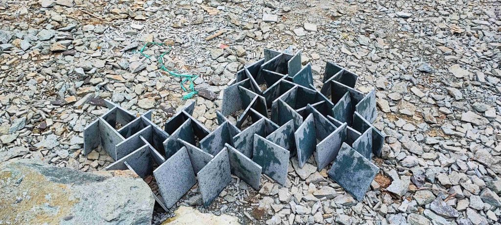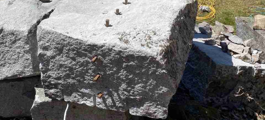 Stone is cut using the “plug and feather” technique which involves placing special tools to form a cut line in the stone.